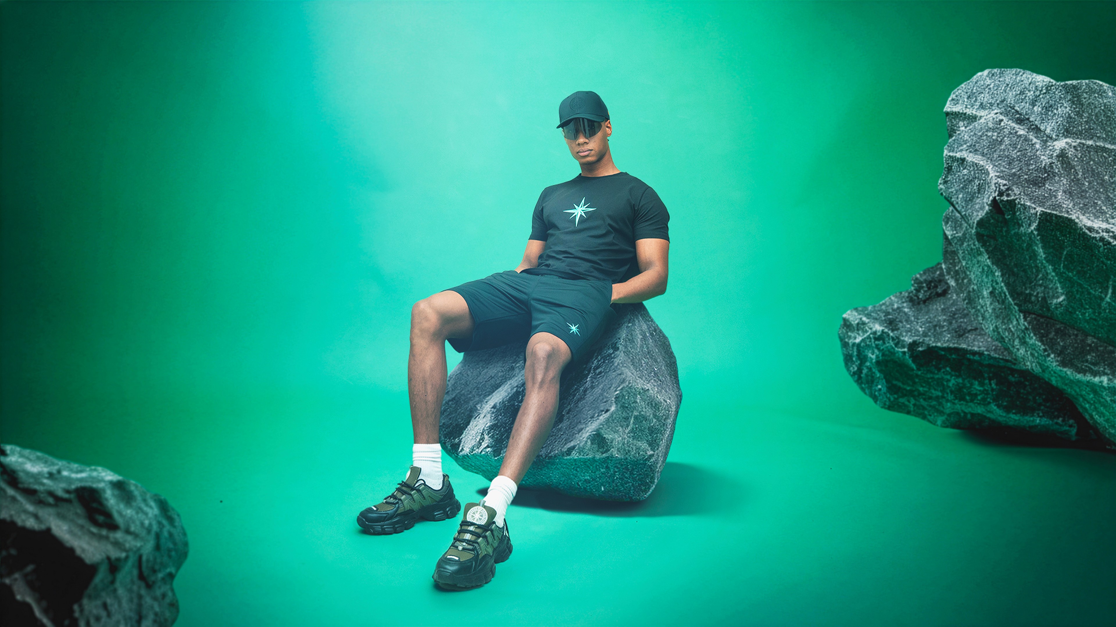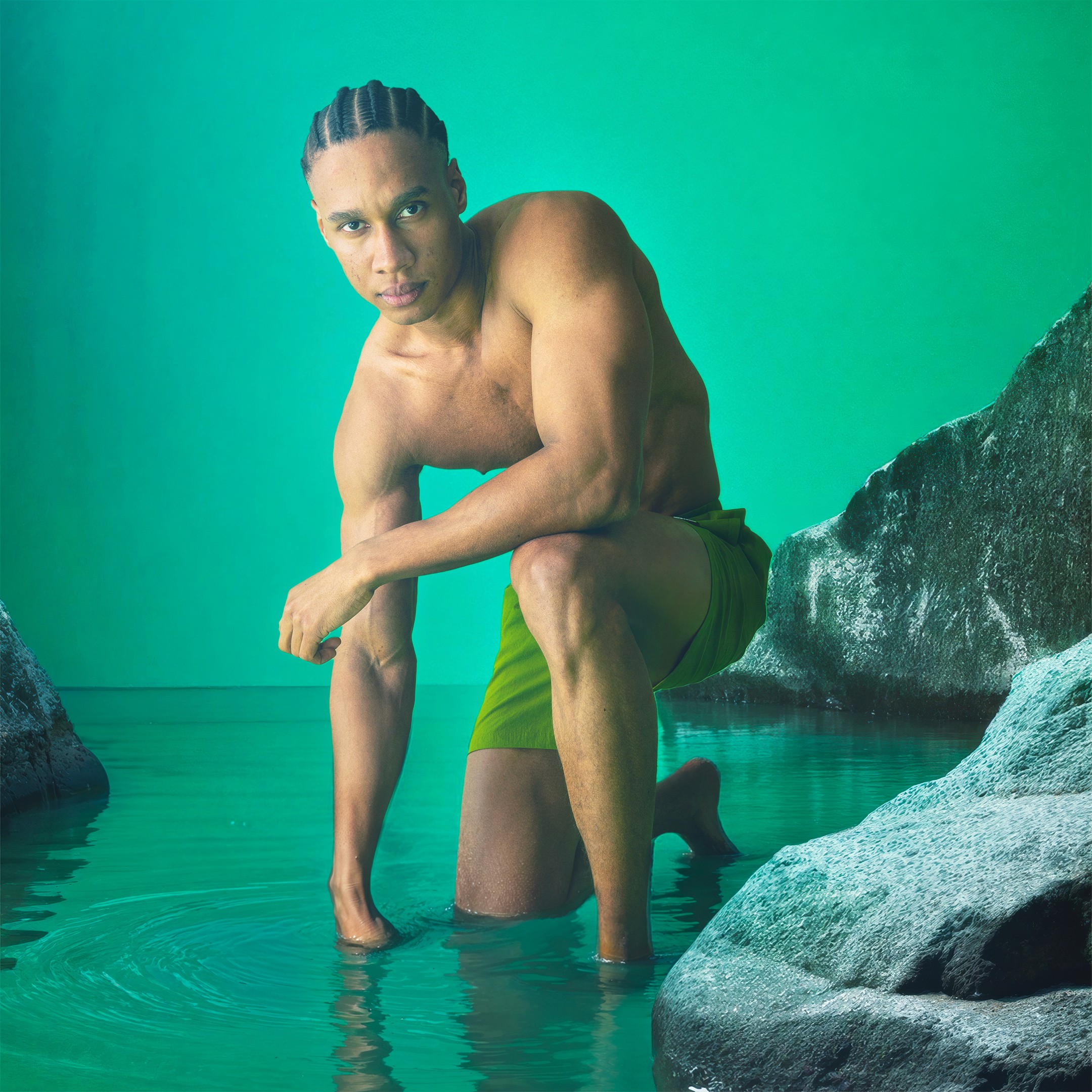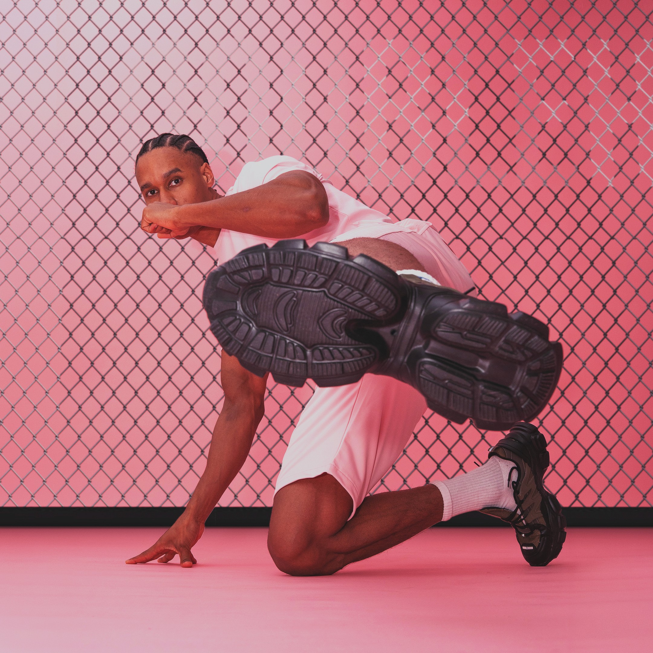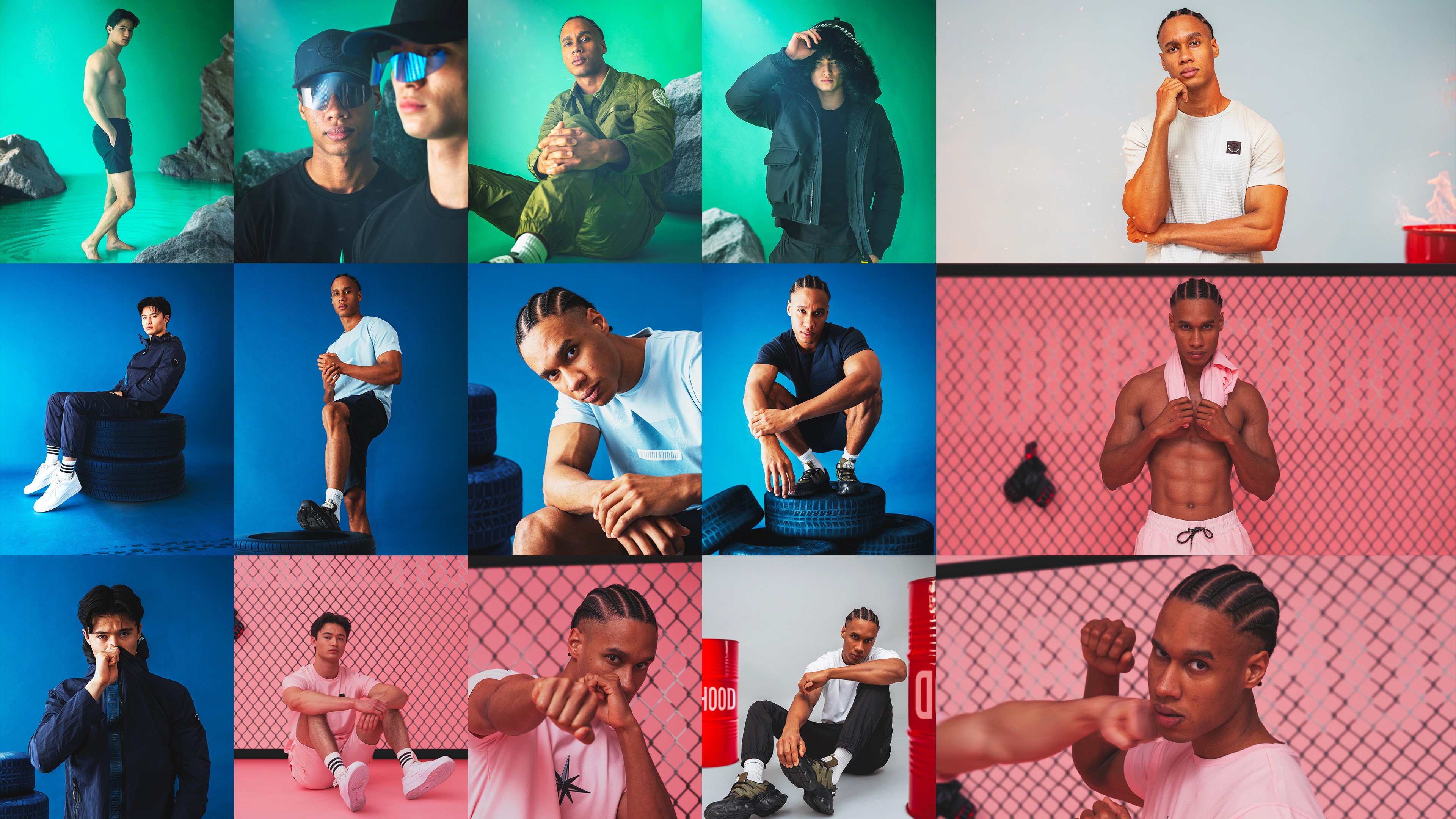 Le parti pris a été de structurer la campagne autour d’ambiances monochromes puissantes, enrichies de textures brutes et d’éléments symboliques. Chaque couleur de la collection est associée à un territoire visuel distinct. Le vert s’inscrit dans un environnement minéral composé de roches massives. Le bleu dialogue avec des textures de pneus et un imaginaire industriel. Le gris prend place dans une atmosphère de barils en feu. Le rose se confronte à l’esthétique d’une cage de MMA. Les maillots évoluent dans un univers aquatique dense et immersif.