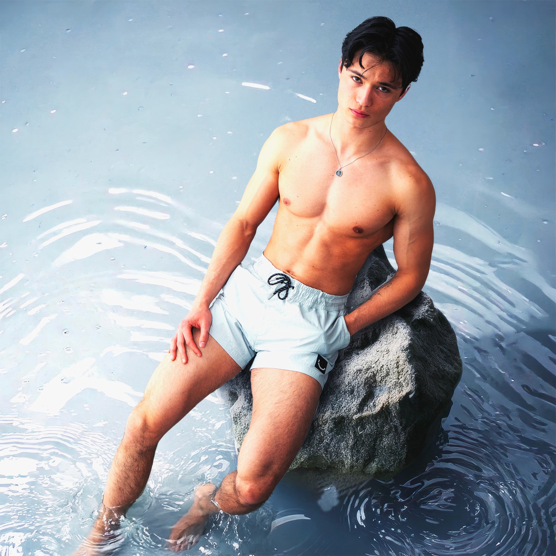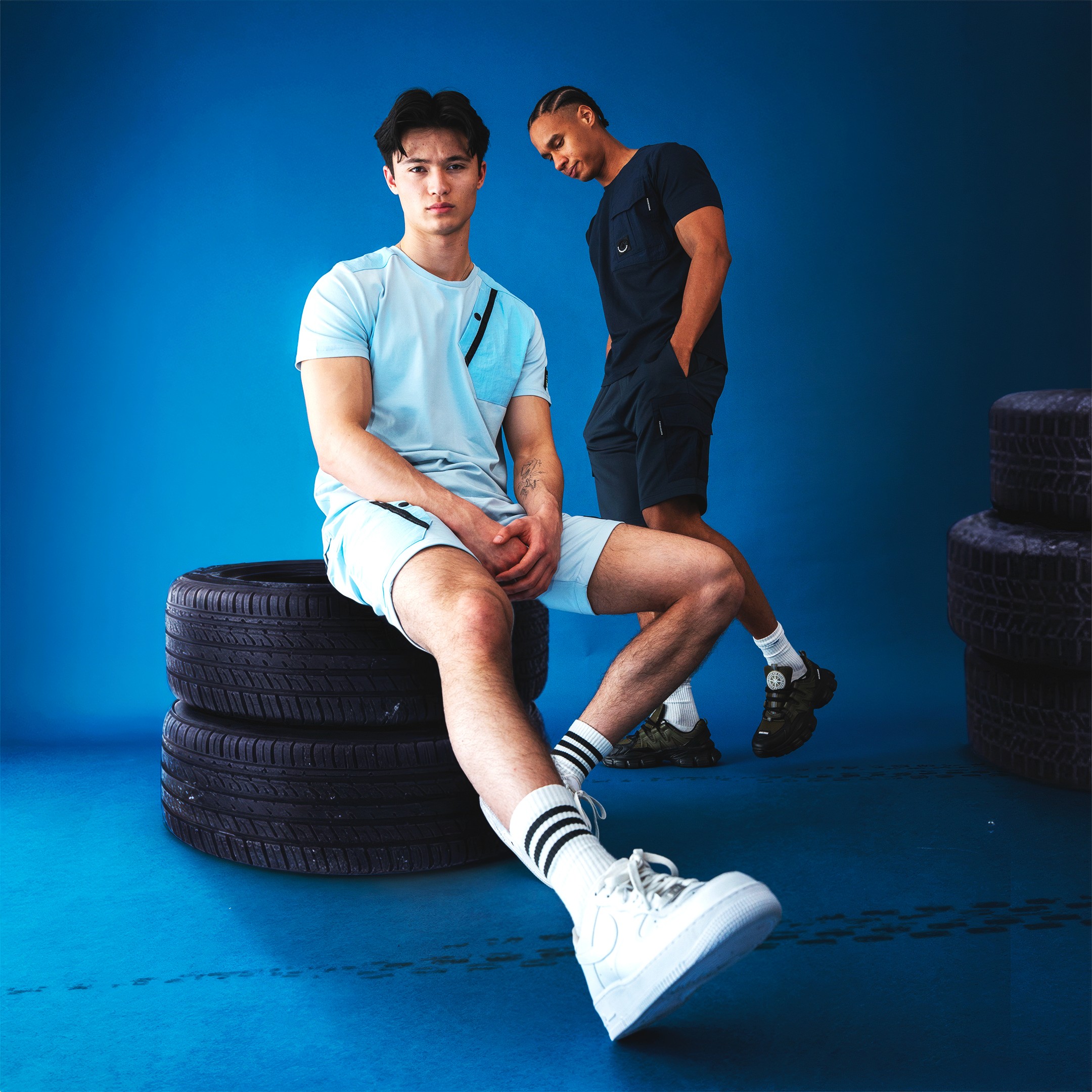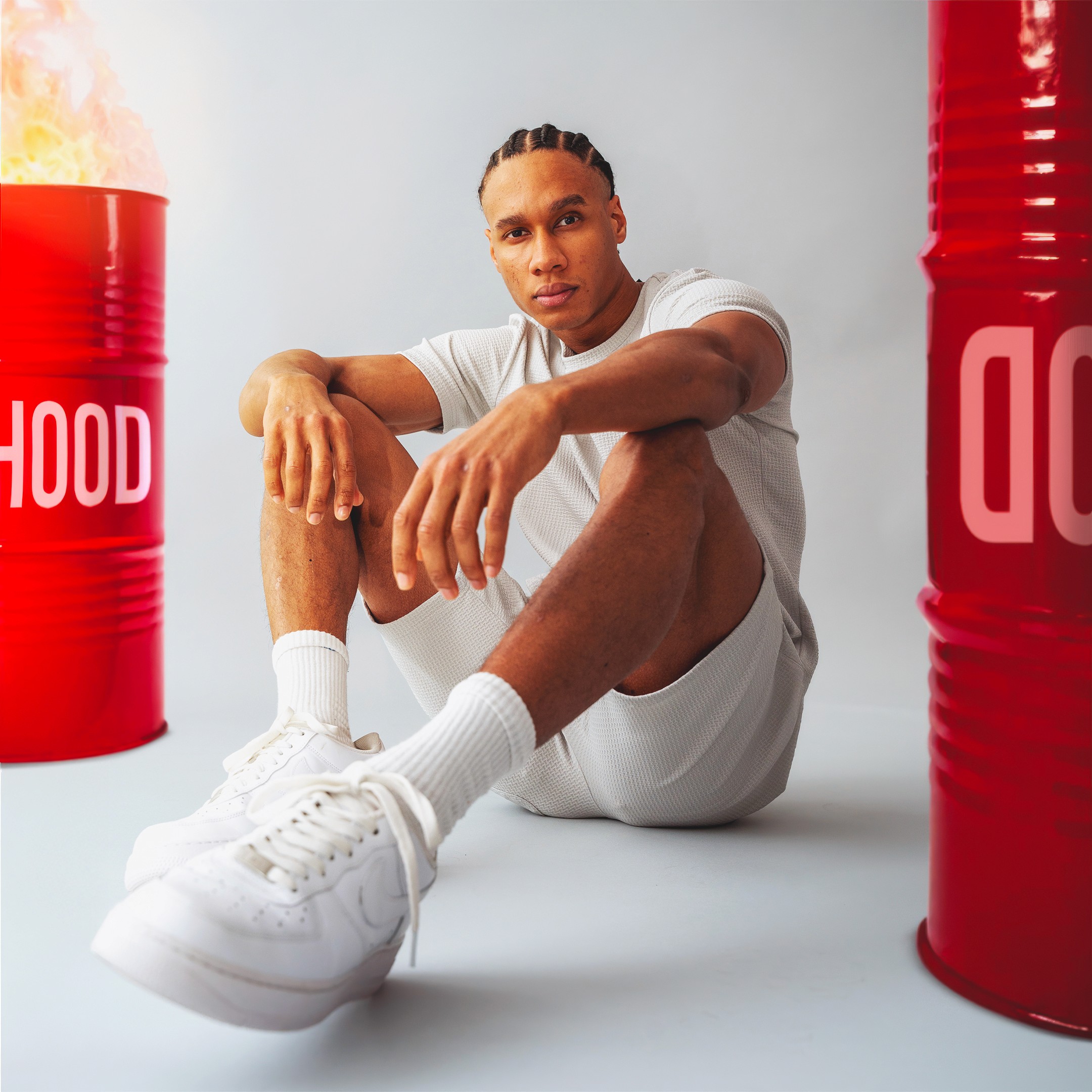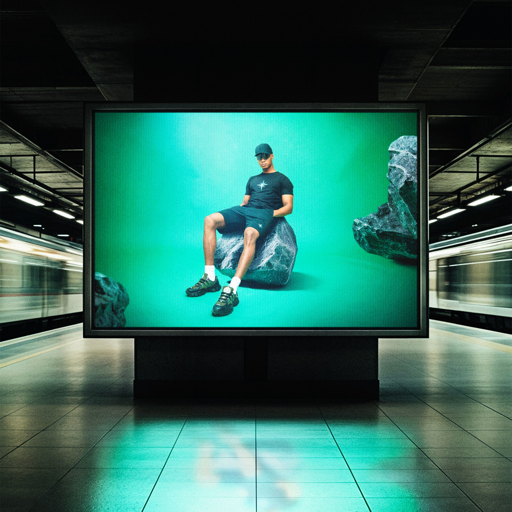 Le parti pris a été de structurer la campagne autour d’ambiances monochromes puissantes, enrichies de textures brutes et d’éléments symboliques. Chaque couleur de la collection est associée à un territoire visuel distinct. Le vert s’inscrit dans un environnement minéral composé de roches massives. Le bleu dialogue avec des textures de pneus et un imaginaire industriel. Le gris prend place dans une atmosphère de barils en feu. Le rose se confronte à l’esthétique d’une cage de MMA. Les maillots évoluent dans un univers aquatique dense et immersif.